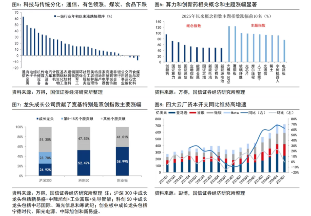 ]article_adlist-->核心结论:①近期股市和经济走势背离:经济数据弱、中报业绩疲软,但股市表现强劲。②股市结构分化明显,以算力为代表的少数科技股贡献了指数一半涨幅,背后有产业逻辑和业绩支撑。③借鉴过去牛市,基本面改善和行情演绎会逐渐扩散,科技大趋势不变,风格或阶段性向价值平衡。