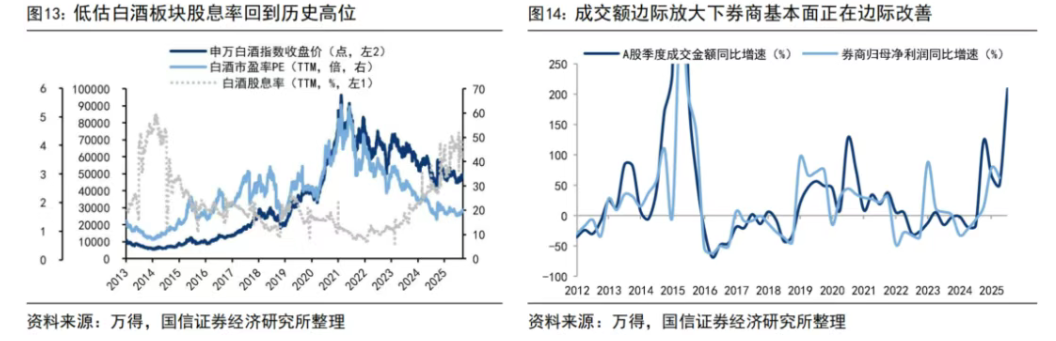 这次科技大趋势不变,关注风格可能阶段性再平衡。24/09以来的这轮行情始于宏观政策导向转向抗通缩,但中长期看促转型仍是关键;叠加AI浪潮引领下科技产业周期向上,因此科技依然是本轮行情的主线。不过25/04以来科技板块涨幅已较为显著,借鉴过去两轮牛市经验,牛市中期价值板块或存在补涨机会,具体而言,关注以下领域:一是地产,去年9/26中央政治局会议以来“稳住楼市股市”政策决心强大,近期北上深等核心城市调整限购政策,8月以来楼市基本面已出现积极变化,股价已经调整5年、估值低的地产有重估潜力。二是以白酒为代表的消费,白酒指数已经下跌5年,股息率回到3.6%处高位,性价比凸显;叠加股市行情回暖对促消费也有积极作用,或推动低估消费板块上行。三是券商,去年924以来股市行情回暖,成交明显放量,中报券商净利润同比已经回升至63%,8月以来成交额放大,未来利润增速有望进一步回升,且金融创新业务将拓宽券商营收。